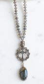 Express your faith boldly with this exquisite handcrafted, statement necklace that marries artisan style with Christian imagery. At its core sits an intricately detailed silver plated Crown of Thorns with a captivating Labradorite cabachon stone in a sterling silver bezel setting. The Crown and stone drop measure 2.5 inches long. The Labradorite in both the pendant and the beads has beautiful flashes of blue that may not show up in photos due to flash photography.