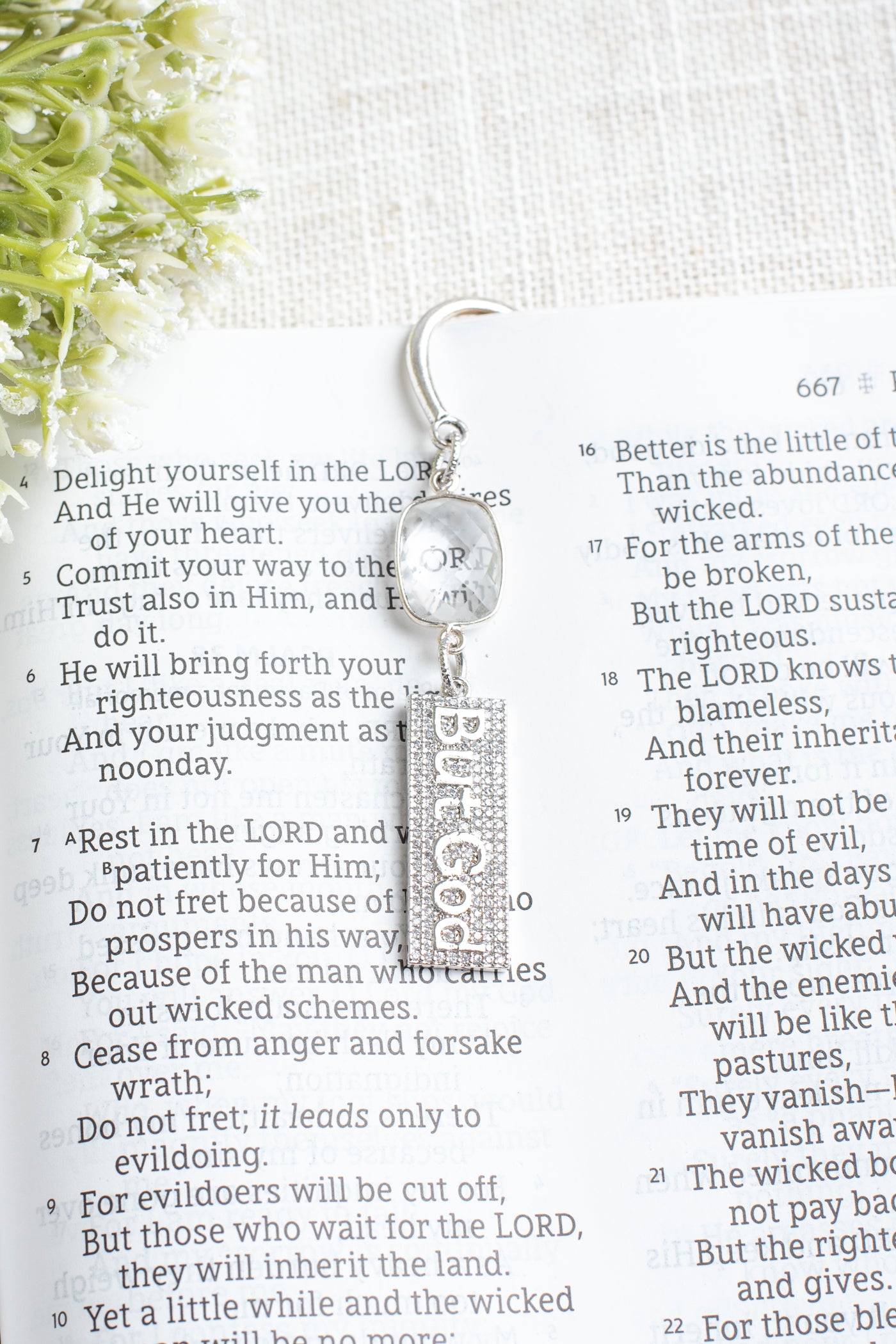This exquisite handcrafted shephard's hook bookmark measures 4.75 inches in length with a refined 0.75 inch width, featuring a micro pave silver-plated BUT GOD charm paired with an elegant crystal drop accent. This piece was individually created, making it a distinctive accessory for book lovers and a thoughtful Christian gift option. The sophisticated design combines meaningful sentiment, perfect for those who appreciate both details and inspirational touches in their everyday items.