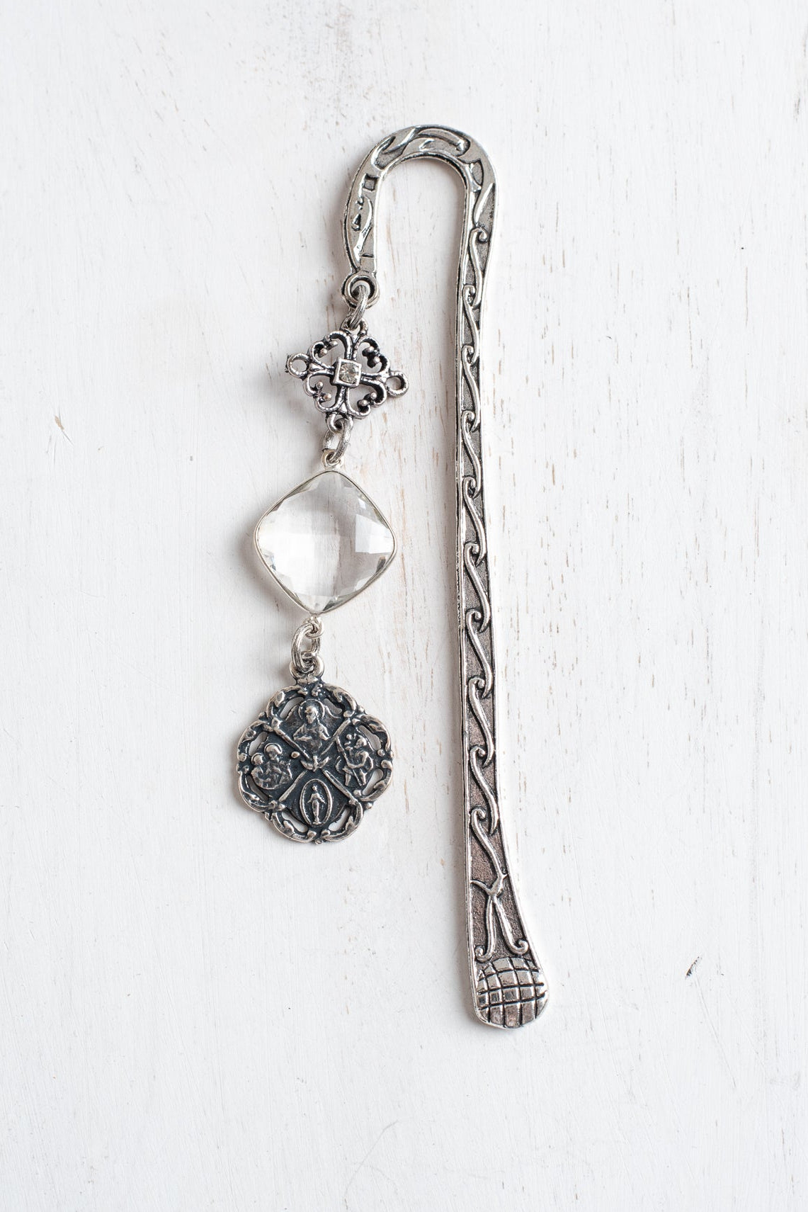 Custom Catholic Silver Metal Bookmark with Catholic Medal, Crystal, and Filigree Silver Drop