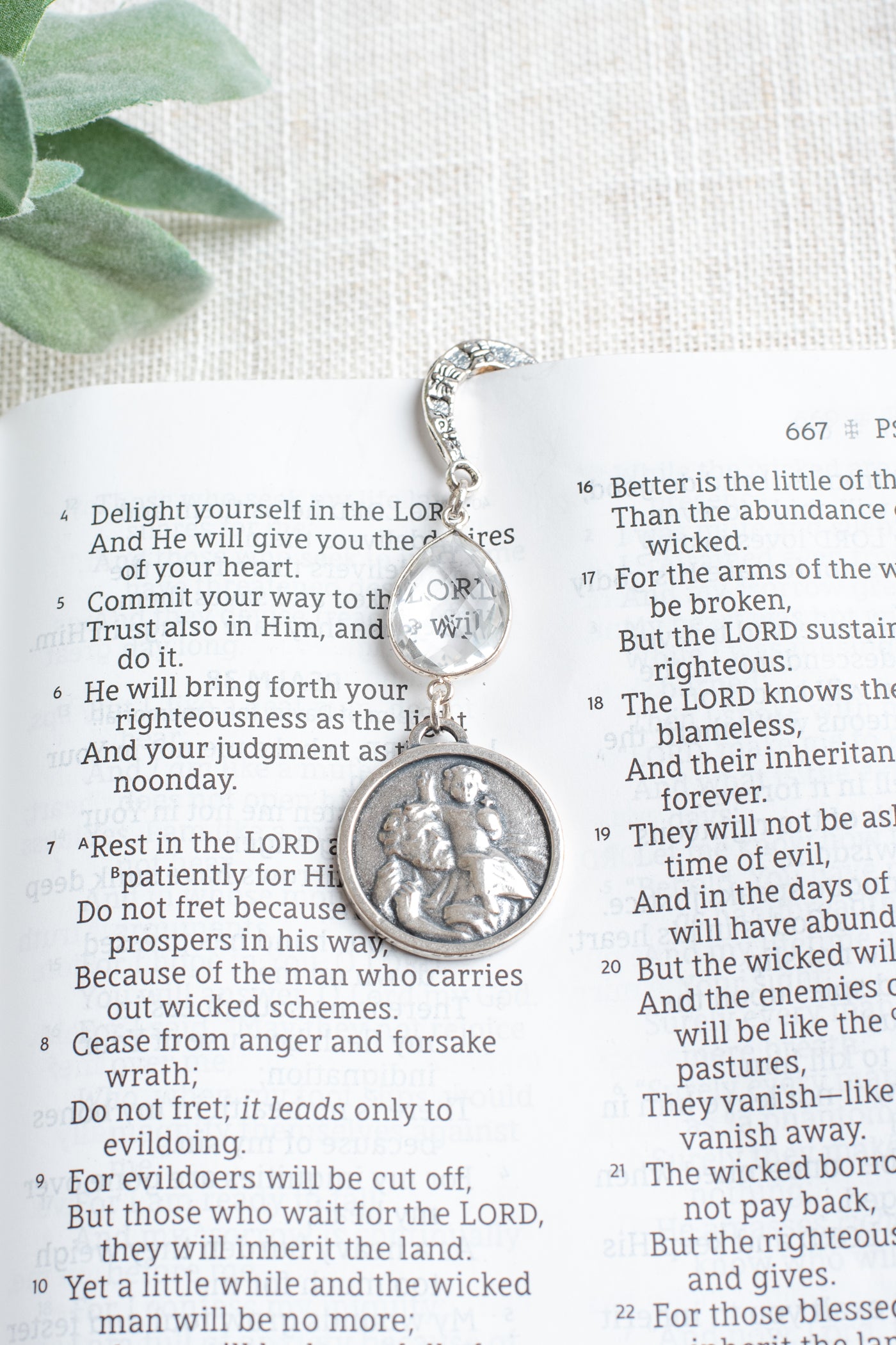 Silver Tone Shephard's Hook Custom Bookmark with a Large Catholic Coin and Crystal Drop