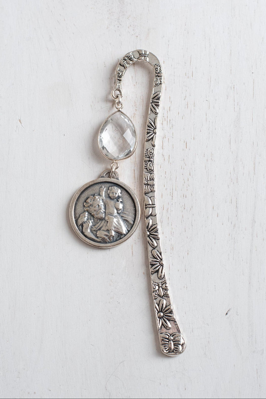 This exquisite handcrafted shepherd's hook bookmark has a floral relief and measures 4.75 inches in length with a refined 0.75-inch width, featuring a 1" inch diameter Catholic coin paired with an elegant crystal tear drop accent. Each piece is individually created, making it a distinctive accessory for Christian book lovers and a thoughtful gift option. The sophisticated design combines meaningful sentiment with polished craftsmanship, perfect for those who appreciate quality details and inspirational touches.