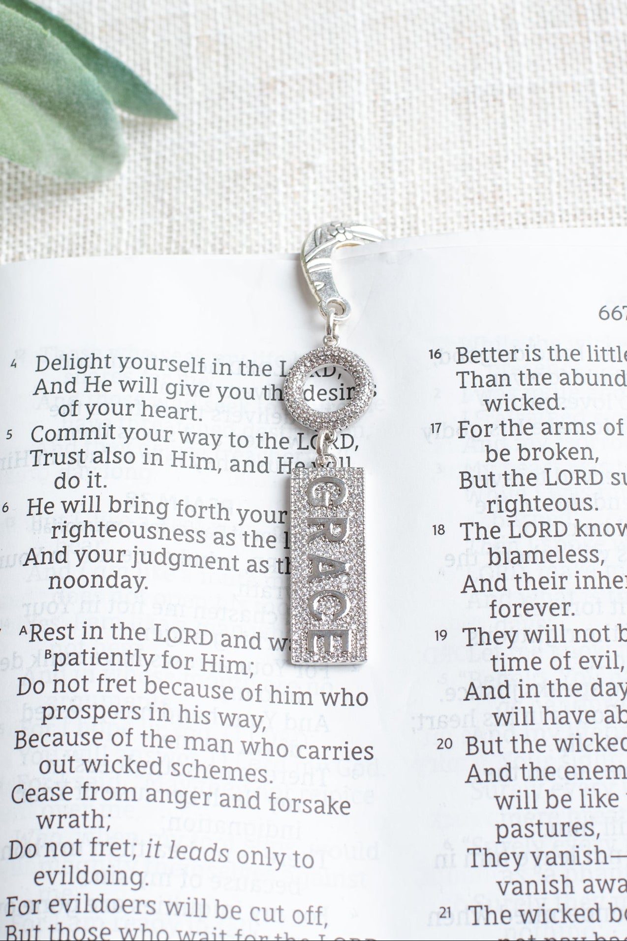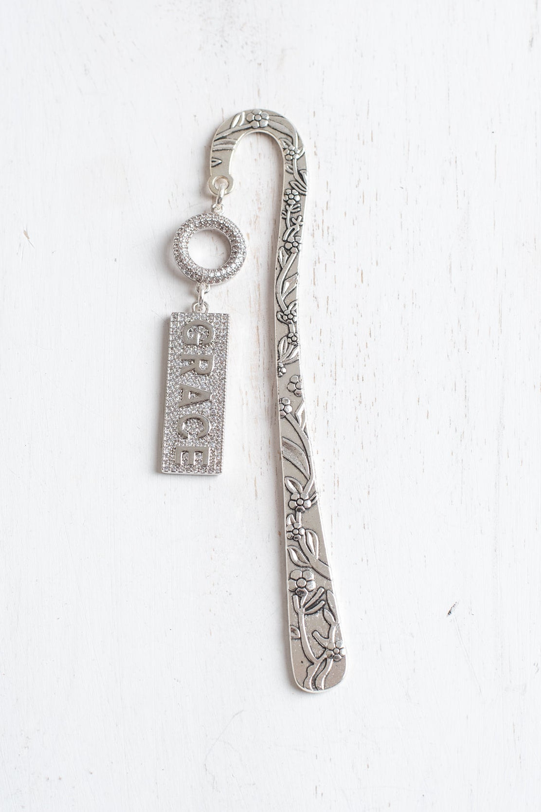 Ornate Silver Tone Shepherd's Hook Bookmark with a Micro Pave "GRACE " Charm