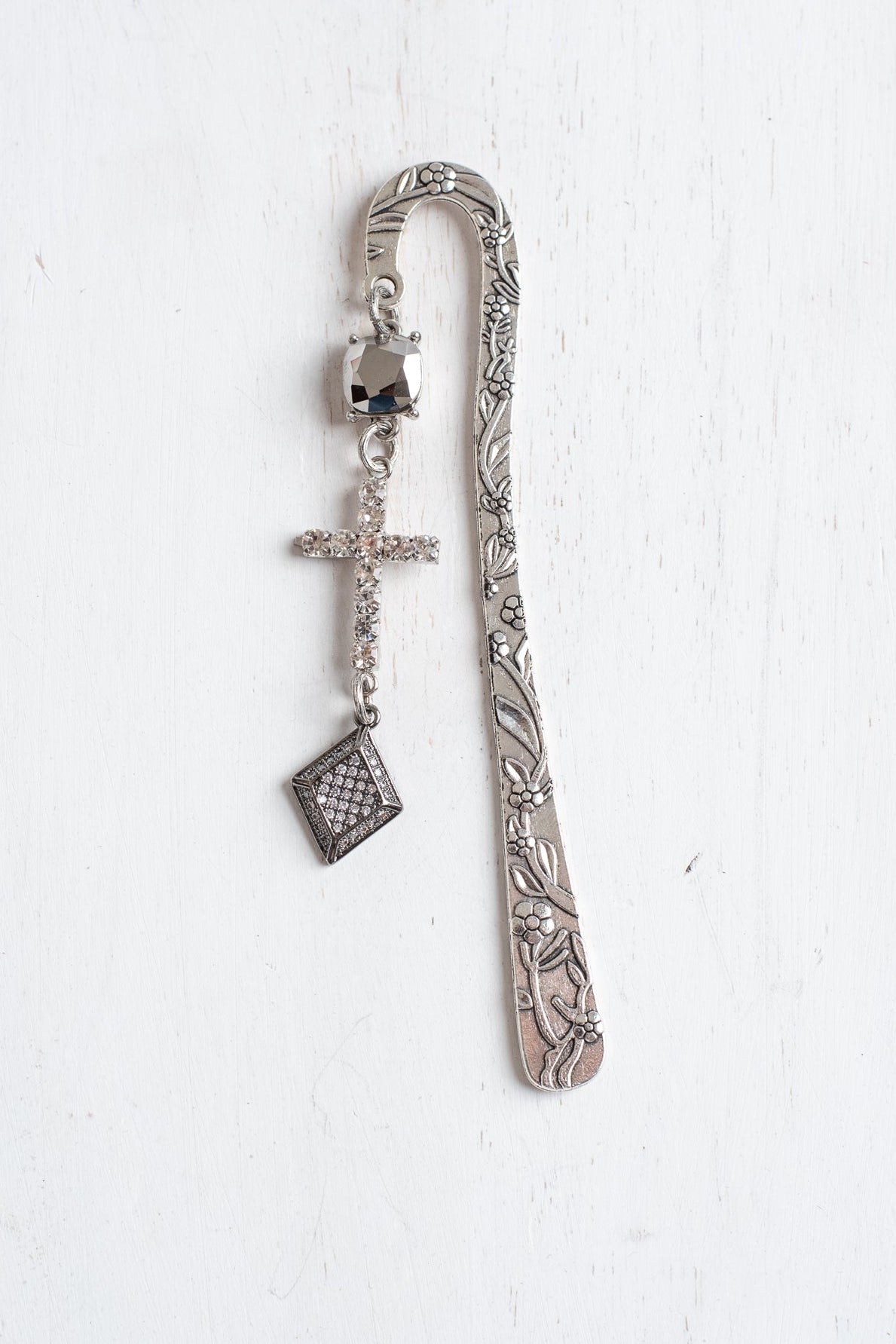 New silvertone shepherd's hook bookmark measures 4.75 inches in length with a 0.75 inch width, featuring a large crystal rhinestone cross cdropped from a deep gray square crystal. It is finished with a gunmetal micro pave diamond shaped charm. This piece was individually created, making it a one-of-a-kind artistic accessory for book lovers and a very special Christian gift option. The design combines meaningful sentiment, perfect for those who appreciate both details and inspirational touches.