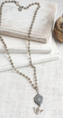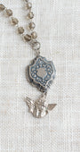 Sterling Silver Cherub and Vintage Style Silver Plated Shield Filigree Pendant on a Taupe Crystal and Silver Rosary Chain Necklace