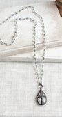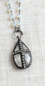 This unique Christian necklace showcases a hand-soldered teardrop crystal pendant adorned with a sparkling rhinestone cross, measuring 1 5/8 x 1 inch. Paired with luminous opalite crystal beads on a gunmetal rosary chain, it combines spiritual elegance with artisan craftsmanship. The lobster claw clasp ensures security, while this piece's one-of-a-kind design makes it a truly distinctive accessory. Perfect for those seeking meaningful jewelry that reflects both faith and refined taste.