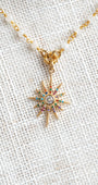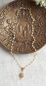 Delicate Gold Starburst Pendant on a Moonstone and Gold Plated Rosary Chain Necklace