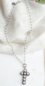 This elegant Christian statement necklace has strong old word European style. It is a handmade, one-of-a kind treasure. The necklace has faceted crystal beads strung on a 27 inch antique silver metal rosary chain. The centerpiece is an ornate pectoral sterling silver cross adorned with freshwater pearls that are bezel set. The pendant measurement including its with self bail is 3 x 1 5/8 inches and has the words, "The Lord be with you" on the reverse side. The pendant drops from the necklace on a antique silvertone metal connector. The closure is a custom made silver plated fancy hook and eye. This is a Christian heirloom statement necklace that shows your faith boldly. Perfect for yourself or as a timeless special gift.