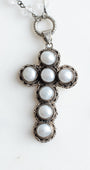 Ornate Pearl Sterling Silver Renaissance Christian Cross Pendant on a Crystal Rosary Chain Necklace