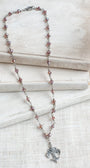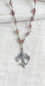 This lovely rosary chain necklace featuring a beautifully detailed antique silver-plated fleur de lis pendant measuring 1.25 inches. Deep red AB faceted crystals flash purple and blue adding sparkle and dimension to the silvertone chain. At 21 inches long, with a secure lobster claw clasp, this versatile piece works wonderfully as a standalone statement or layered with other necklaces. Ideal for those seeking meaningful jewelry that blends spiritual elegance with contemporary sophistication.