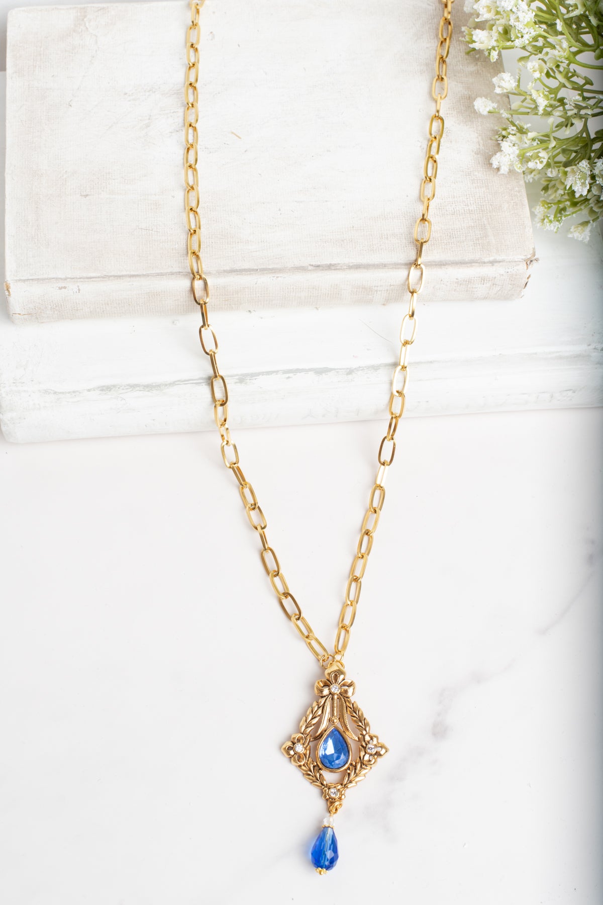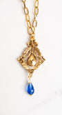 This truly unique AVON signed vintage pendant was made in the 20th century and captures timeless elegance with its ornate gold-tone filigree design and a lovely and feminine style. Adorned with royal blue rhinestones and a crystal tear drop, the 3 x 1.5 inch pendant makes a beautiful statement. The gold filigree incudes laurel edges and a large bow at the top. The pendant is showcased on a new gold plated paperclip chain that is 30 inches long. A gold-tone lobster claw clasp ensures secure fastening for everyday elegance.