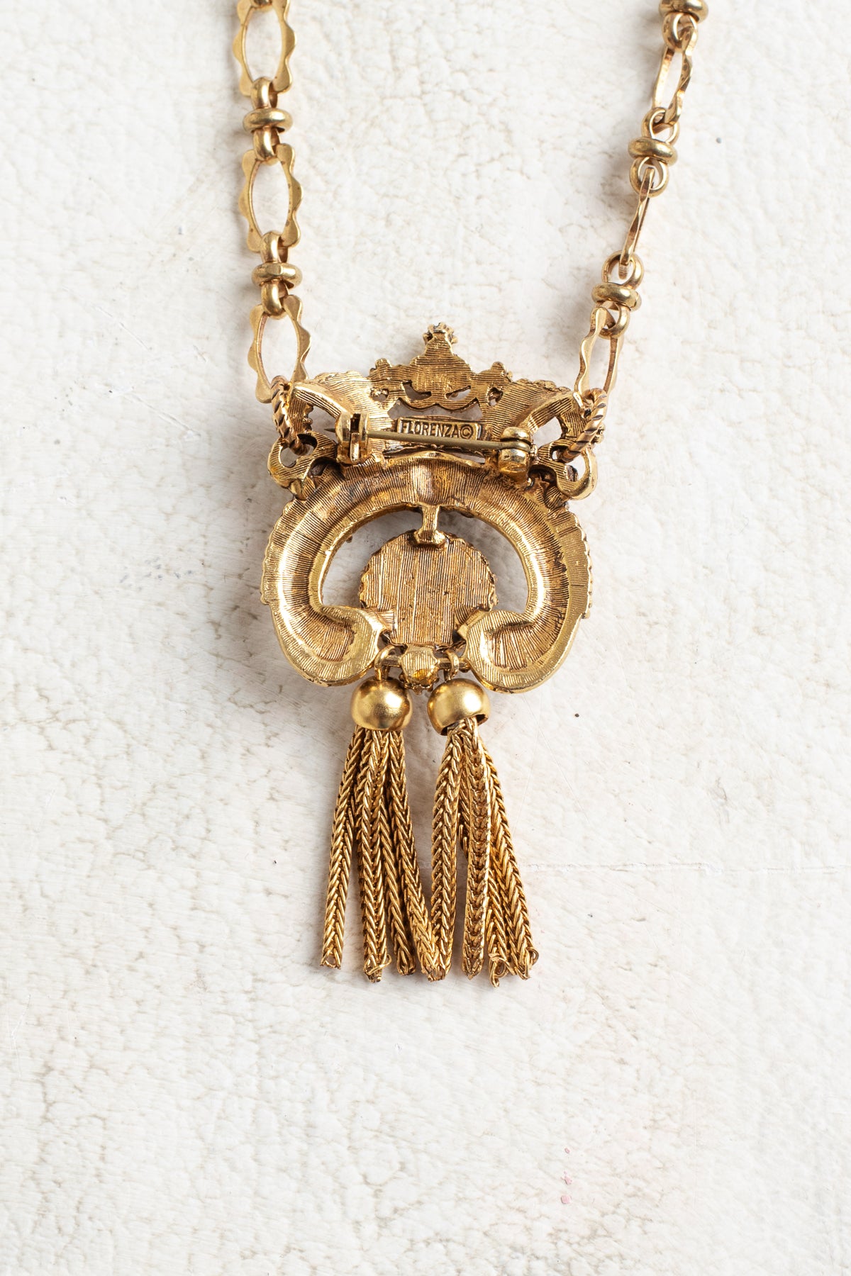 This truly unique vintage brooch pendant was made in the mid 20th century circa 1960 and designed and signed by Florenza. The pendant is in a rounded crown shape having an ornate gold-tone filigree design and luxurious embellishments. Adorned with brown and topaz rhinestones, plus faux pearls and two chain tassels, the 3 x 1.5 inch pendant makes an elegant statement piece. The versatility is unmatched—wear it as a pendant on the included 30 inch decorative style chain with scalloped ovals that matches the pendant, or detach it to showcase as a brooch. Crafted in the coveted Italian style, this signed collector's treasure combines vintage charm beauty. A matching gold-tone lobster claw clasp ensures secure fastening for everyday elegance.