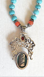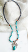 The center Turquoise bezel set cabachon measures 1 x 3/4 inches. The beaded necklace design unfolds beautifully from the center upward with 5.5 inches of lustrous 9mm faceted solid Turquoise beads, transitioning into seven inches of ethereal Gray Quartz. Carnelian and silver details are added throughout to enhance the warmth and richness of this one-of-a-kind piece. Ideal for anyone who values jewelry that speaks to both the eye and the soul.