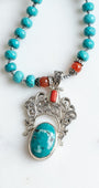 Bold Statement Necklace with Significant Filigree Sterling Silver Turquoise Pendant on a Hand Strung Necklace of Turquoise, Quartz and Carnelian Beads