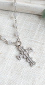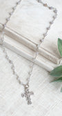 Vintage Style Gray Quartz Rosary Bead Necklace with a Sterling Silver Swirled Cross in Pave Crystal Stones
